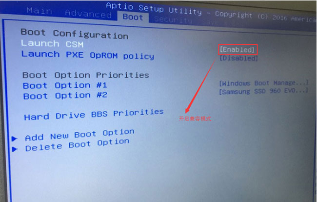 2、在重启后切换到BOOT的选项,把Launch CSM由disabled改成enabled,开启兼容模式;