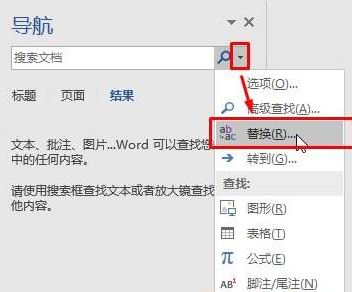 1、首先,我们可以在Word中按下“Ctrl+F”组合键呼出导航界面,点击搜索框后面的“放大镜”,点击“替换”;