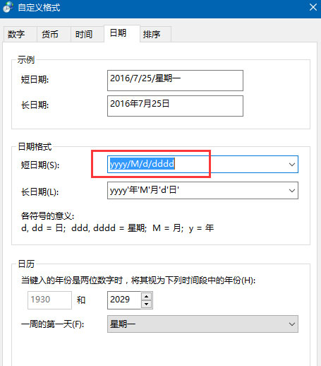 3、接下来,在自定义格式中点击日期格式下的短格式选项,选择yyyy/M/dddd,最后再点击确定退出即可在任务栏上显示星期几了。