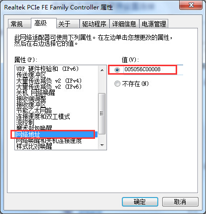 2、然后,在打开高级选项,选择属性中Network Address(PS:可能有些网卡显示的是网络地址,有的用Network Address,Intel网卡用Locally Administered Address,有网卡可能没有这个选项)在选中右栏框值的文本框中写入可用的MAC地址,格式005056c009在命令行中查到的地址有—横线,这里就可以省略直接输入就可以,最后再点击确定按钮即可。