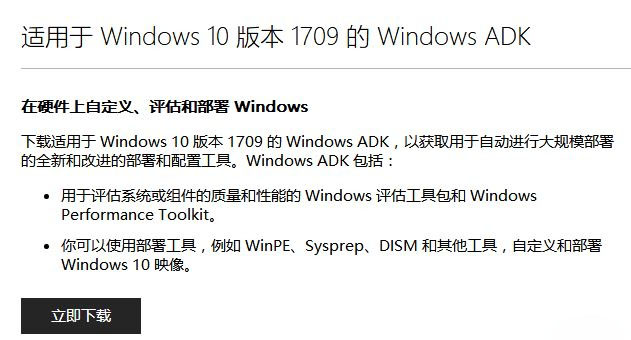 2、然后,在打开该页面后按需求下载最新版的软件,适用于Windows 10版本1709的 Windows ADK,最后在点击立即下载按钮下载即可解决。