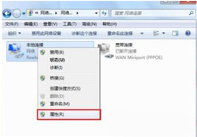 4、在右键点击本地连接,选择属性;