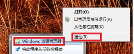 2、然后,在鼠标右键点击任务栏上的资源管理器,选择Windows资源管理器,在菜单中选择属性查看,打开属性;