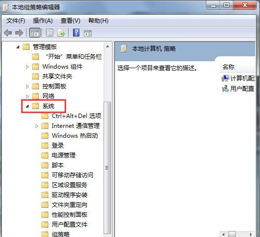 3、在管理模板展开项中找到:系统并展开;