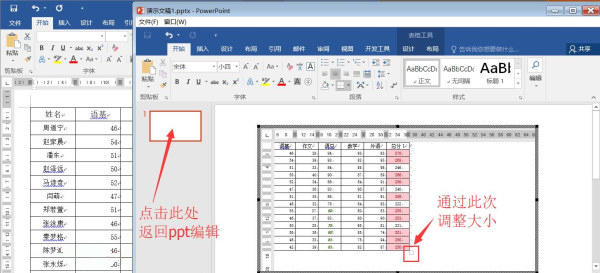 4、最后再返回ppt界面在和源文件即可比对一下是不是一模一样(如果想要修改也很方便,直接双击表格本身,进入嵌入的word界面,跟在word中修改表格一样方便)。