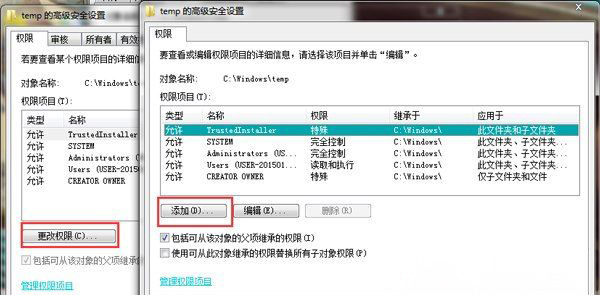 2、然后,在单击高级,在弹出Temp的高级安全设置,在点击更改权限,再弹出窗口单击添加;