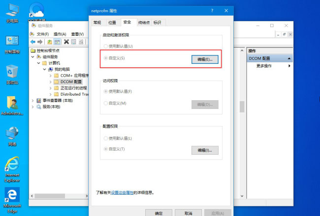 4、接下来,在切换到启动和激活权限,在单击自定义;