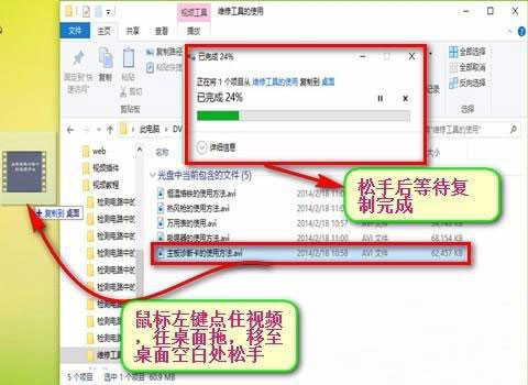 6、在打开后就可以看到有很多个视频,在选择要复制出去的视频,在点住直接往电脑桌面上拖,移至桌面空空白处松手,等待复制完成;