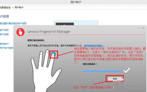 8、进入笔记本指纹管理系统后,在选择需要录入指纹的手指,将选定的手指指纹向下,手指放平稍用力滑过电脑上的指纹传感器,一次可能不会成功,多刷几次,等指纹注册进度条满以后,会在操作界面右下角显示“完成”,此时手指的指纹信息已经成功地在电脑中注册成功了,退出指纹管理系统,下次开机时就可以刷指纹登录你的笔记本电脑了。