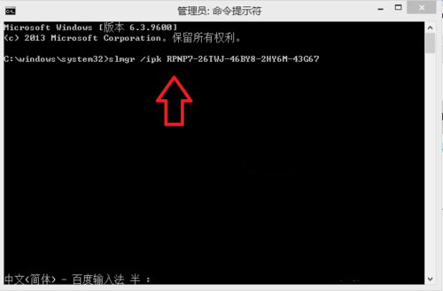 2、然后,在输入恢复命令:输入slmgr /ipk XXXXX-XXXXX-XXXXX-XXXXX-XXXXX,后面为前面记录的激活密钥,之后按下回车键;