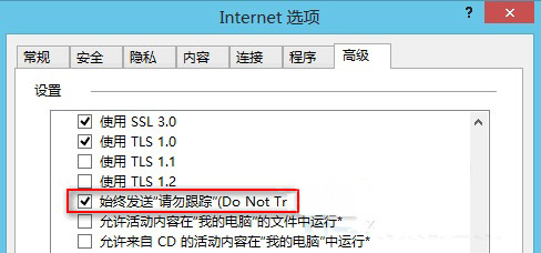 2、然后,在安全区域中找到始终发送请勿跟踪(Do Not Track)标头选项,在勾选该项即可,最后确定保存(这样就开启了IE10浏览器的禁止跟踪(Do Not Track)功能(使用InPrivate 浏览或添加跟踪保护列表时,会自动启用禁止跟踪功能))。