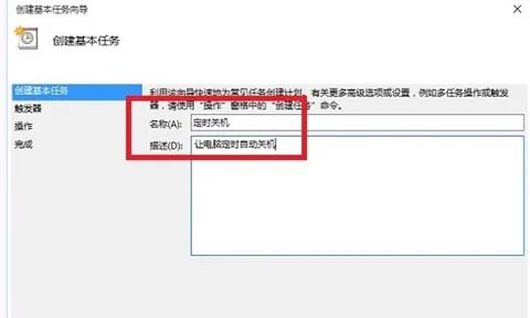 3、给定时关机的任务取个名字,如定时关机,在点击下一步;
